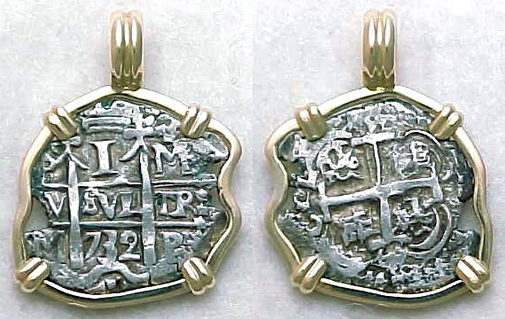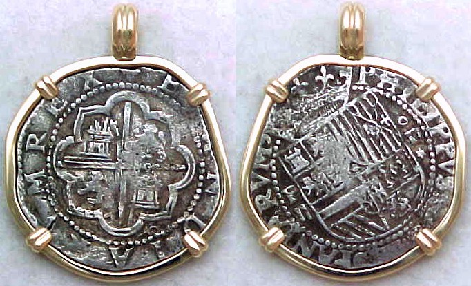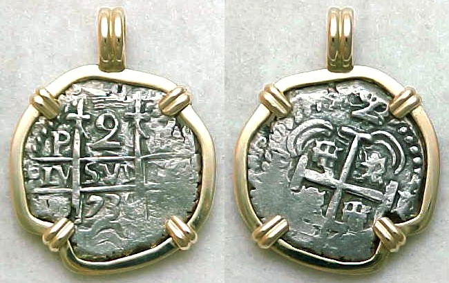 P at left. Coin is mounted in a 14K gold bezel with a fixed