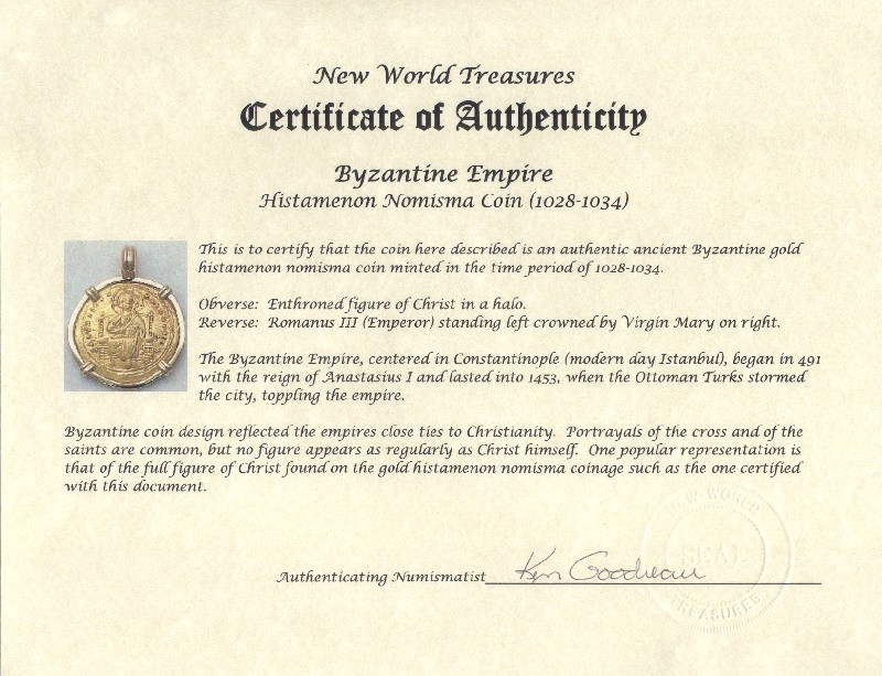 Byzantine coin design reflected the Empires close ties to Christianity. Portrayals of the cross and of the saints are common, but no figure appears as regularly as Christ himself. One representation of Christ is that of the bold full bust of Christ found on the gold histamenon nomisma coinage. These coins, when mounted in 14k gold bezels, make exceptionally beautiful and historically significant pieces of religious jewelry. The Byzantine Empire, centered in Constantinople (modern day Istanbul), is generally accepted as beginning in 491 AD with the reign of Anastasius I, and ending in 1453 AD with the toppling of Constantinople by the Ottoman Turks. Certificates of Authenticity accompany all Religious Ancient Byzantine Gold Histamenon coin jewelry. View a typical New World Treasures photo type Certificate of Authenticity.