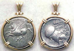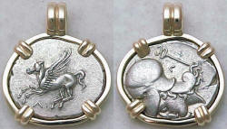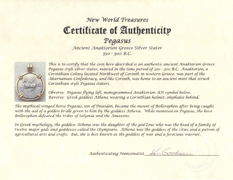 Pegasus (or Pegasos) ancient coins were minted in Corinth Greece and many of her colonies, during the time period of 405 to 307 BC. The coin features the mythical winged horse Pegasus on one side and the Greek goddess Athena, wearing a Corinthian helmet, on the other. In Greek mythology, Pegasus, son of Poseidon, was born from the neck of Medusa when she was killed by the hero Perseus. Pegasus became the mount of Bellerophon, who while mounted on Pegasus, defeated the tribes of Solymia and the Amazons. Athena, the daughter Zeus, is best known as the goddess of war, defending the native lands against all enemies. Certificates of Authenticity accompany all Ancient Greek Pegasus coin jewelry. View a typical New World Treasures photo type Certificate of Authenticity.