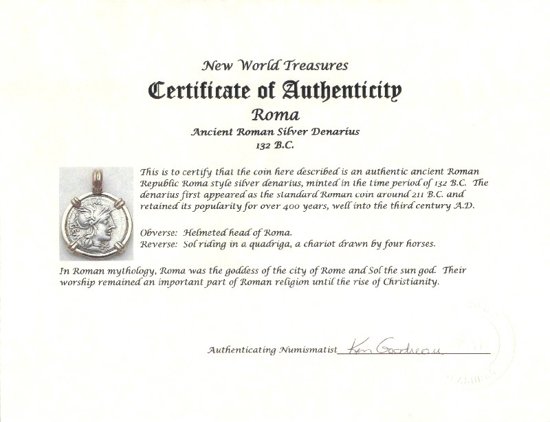 Ancient Roman Republic Roma style silver denarius coins were minted in the time period from 150 B.C. to 100 B.C. The denarius first appeared as the standard Roman coin around 211 B.C. and retained its popularity for over 400 years, well into the third century A.D. In Roman mythology, Roma was the goddess of the city of Rome. The worship of Roma remained an important part of Roman religion until the rise of Christianity. Certificates of Authenticity accompany all Ancient Roman Roma coin jewelry. View a typical New World Treasures photo type Certificate of Authenticity.
