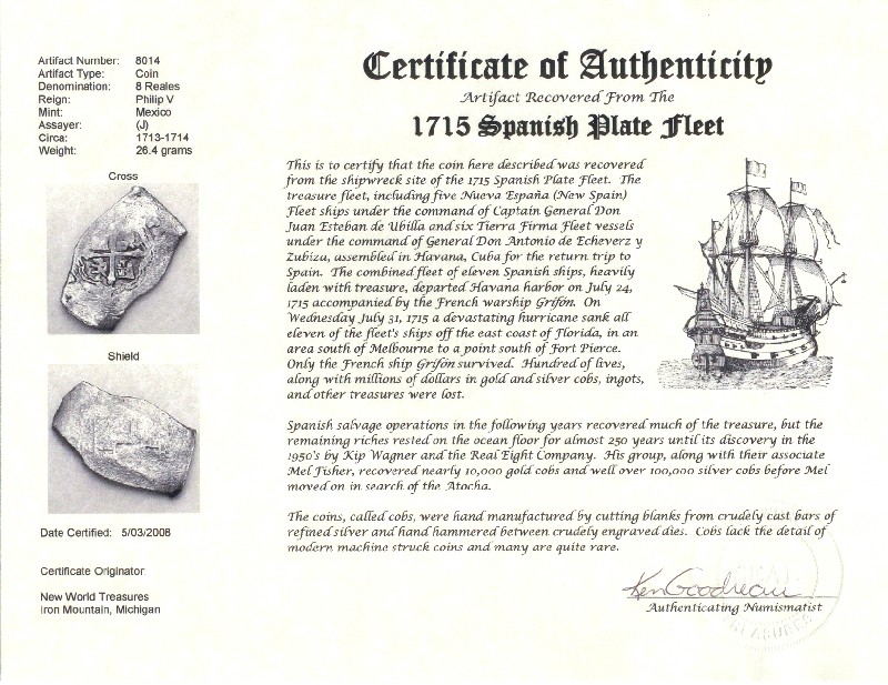 The 1715 fleet was a Spanish convoy of twelve ships bound for Spain from Havana laden with a wealth of New World gold and silver. On Wednesday July 31, 1715, a devastating hurricane sank eleven of the fleet's ships off the east coast of Florida, in an area south of Melbourne to a point south of Fort Pierce. Millions of dollars in gold and silver cobs, ingots, and other treasures along with hundreds of lives were lost. Spanish salvage operations in the following years recovered much of the treasure, but the remaining riches rested on the ocean floor for almost 250 years until its discovery in the 1960's by Kip Wagner and the Real Eight Company along with their associate Mel Fisher. Certificates of Authenticity accompany all 1715 Fleet Shipwreck treasure coins. View a typical New World Treasures photo type Certificate of Authenticity.