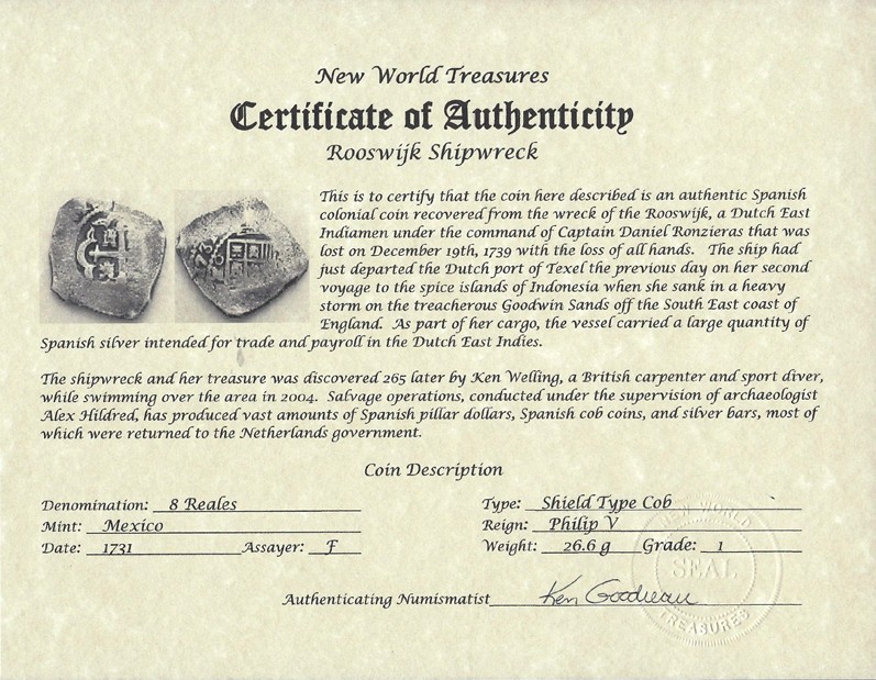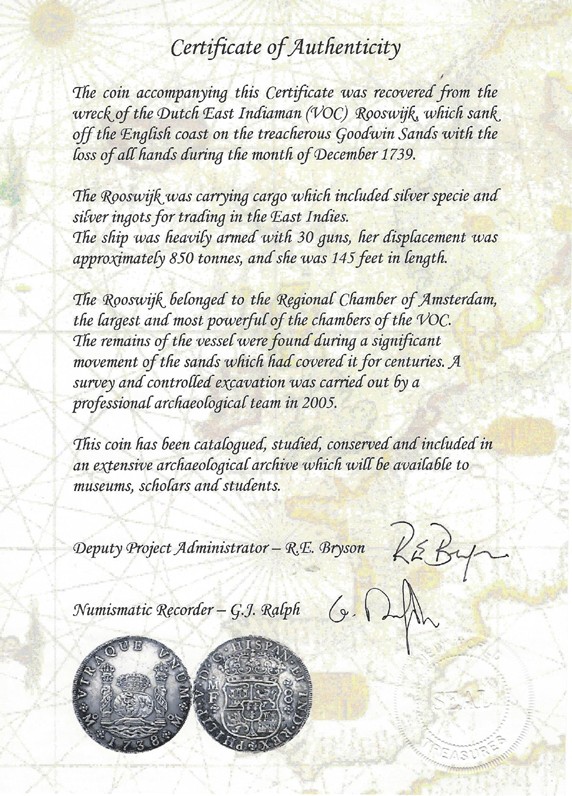 Certificates of Authenticity accompany all Rooswijk Shipwreck treasure coins.